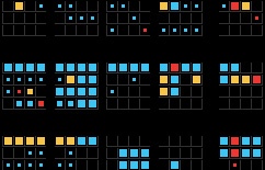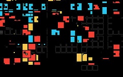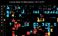 If a track is active, a red dot moves horizontally through it. Each time this dot hits a coloured square set by one of the performers, a sound is triggered by the audio engine. Each performer has their own colour, making it possible for the audience to follow who is doing what. The movement of the scanning dot can be quite complex: each track can have its own direction, offset, speed, and length, providing a simple yet highly effective way to create constantly permutating musical structures.