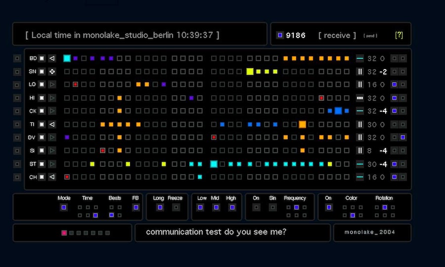 Following the successful first performance at the MUTEK festival in Montreal in 2002 with me in Berlin and Scott on stage in Montreal, the software was refined and revised multiple times. This allowed for more complex interactions, incorporated a more advanced chat function, and — resulting from a programming error that turned into a feature — introduced a glitch-based destruction of the interface during the performance, synchronised with an equally glitchy deconstruction of the sound.