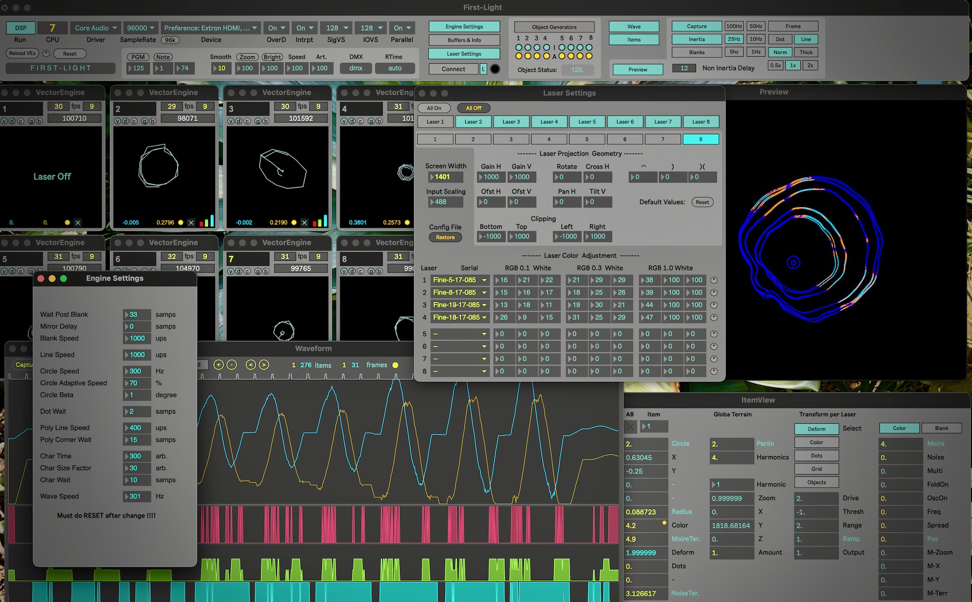 FirstLightEngine is a laser graphics software developed since 2020 by Robert Henke, based on MaxMSP. Thank you Joshua Kit Clayton @Cycling74 for bug hunting and fixing at the speed of light!!!