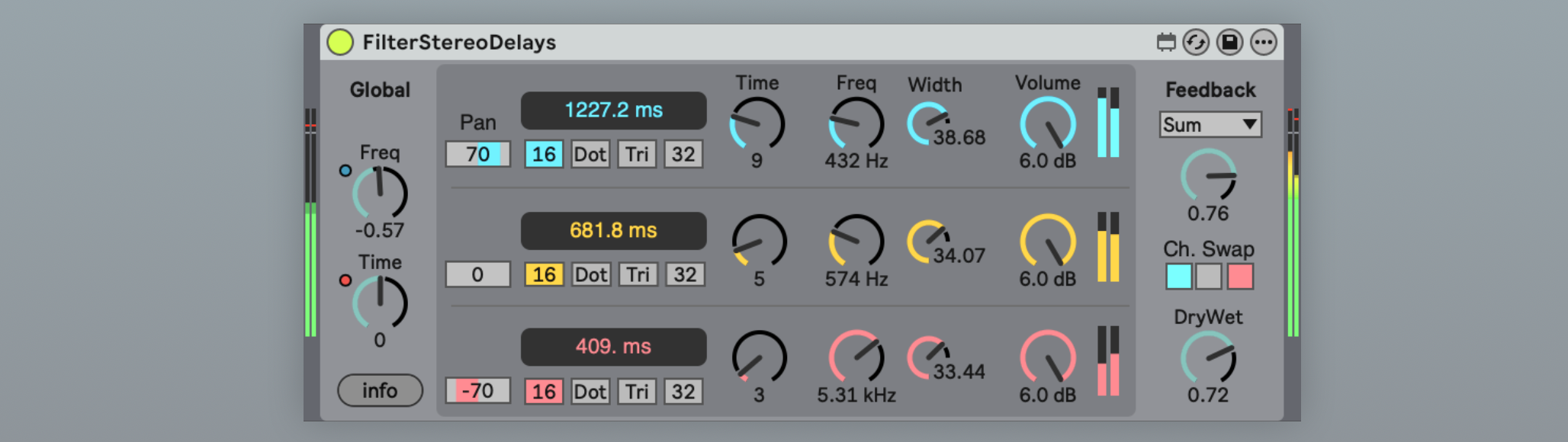 The filters in each delay are controlled by two parameters: center Frequency and Width in semitones around the center. A Global Frequency control allows to shift all filters together. This is an ideal parameter to play with or automate.