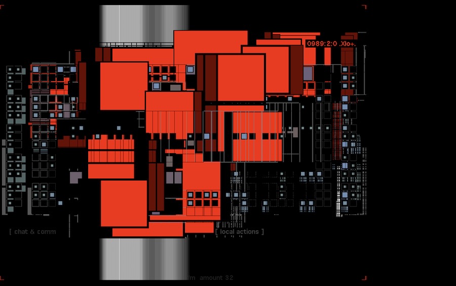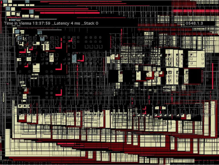 Following the successful first performance at the MUTEK festival in Montreal in 2002 with me in Berlin and Scott on stage in Montreal, the software was refined and revised multiple times. This allowed for more complex interactions, incorporated a more advanced chat function, and — resulting from a programming error that turned into a feature — introduced a glitch-based destruction of the interface during the performance, synchronised with an equally glitchy deconstruction of the sound.