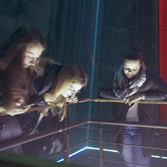 Whilst the lasers in the center of the facility create new visual relationships, big loudspeakers arranged in a remote dark corner provide a complex sonic sculpture, damped by the thick concrete walls. The impact of the sound is dependent on the position of the listener; walking through the installation not only provides different visual perspectives but also varying auditive experiences. The loudspeakers mainly operate in very low frequency regions, on the edge between sound and vibration.Fog machines are placed at different positions in the building. The creation of the fog itself resembles a heavy industrial process; a liquid is heated up and expands at times under high pressure, creating thick white clouds that interfere with the laser light. This is not only visually fascinating, but also clearly audible, the expansion of the gas creates a noisy pulse.
