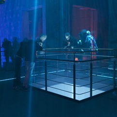 The lasers, the fog machines and the sound interact in a precise choreography, following an algorithmic composition. In contrast to a concert, the installation invites to explore the space at individual pace and attention span. Whilst the concert happens in a space, the installation creates a dialog with it.