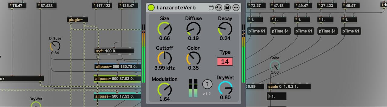 Lanzarote Verb is an exploration of classic allpass- and comb-filter delay configurations, a technique pioneered in the 1960s by digital reverb innovators like Andy Moorer and Manfred Schroeder. My version of it turned out quite interesting. Not at all realistic but certainly recognisable and musically useful. I especially like the rough, scattered reflections it produces when diffusion is low. Imagine crashing waves on black volcanic rocks in a cave. That's why I named it 'Lanzarote Verb'.